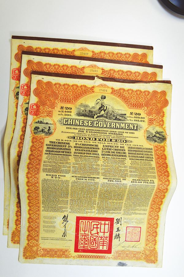 Issued by the Hong Kong & Shanghai Banking Corp. in London for 20 Pounds. English, German, French and Russian text, variety of tax stamps, brown border. 3 pieces.