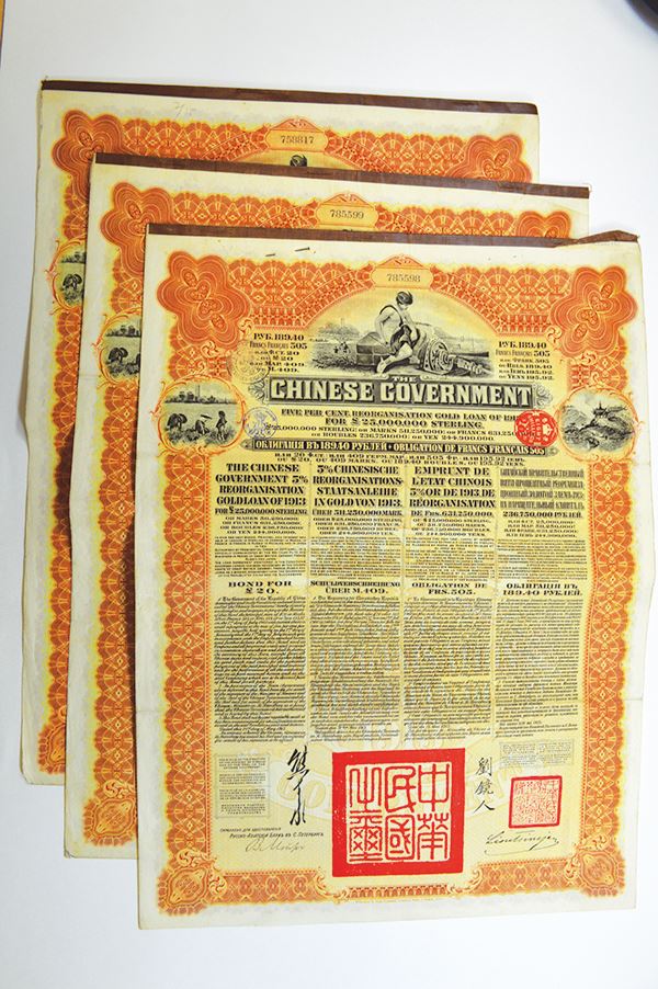 Issued by the Russo Asiatic Bank for 189.4 Roubles. English, German, French and Russian text, variety of tax stamps, brown border. 3 pieces.