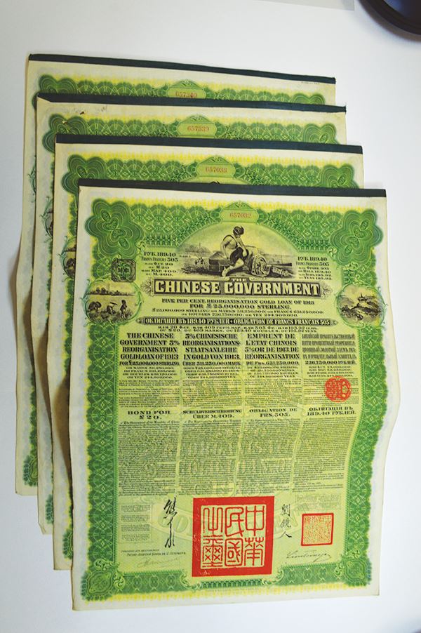 Issued by the Russo Asiatic Bank for 189.4 Roubles. English, German, French and Russian text, variety of tax stamps, green border. 4 pieces.