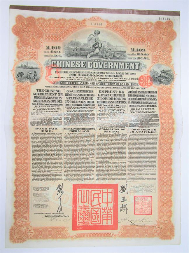 China, 1913. £20 Pounds Sterling I/U 5% Reorganisation Gold Coupon Bond, Black print on ornate brown border and under tint printed in English, German, French, and Russian, Countersigned Deutsch-Asiatische Bank. Allegorical figure at top above title and small illustrations to left and right sides, S/N 161144, VF condition, Waterlow & Sons Ltd.