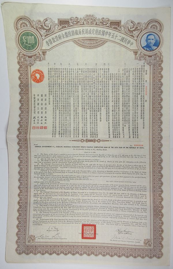 China, 1936. £100, I/U 6% Railway Completion Loan Sterling Coupon Bond, Black text with brown border and beige undertint. SYS at top right, S/N 328, VF condition with some fold lines and signs of wear.