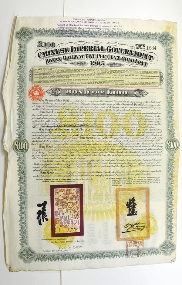 China, 100 pounds. Green border, yellow underprint. Pekin Syndicate, Ltd. 50 coupons attached, the last with tape. Coupon page is detached. Fine.