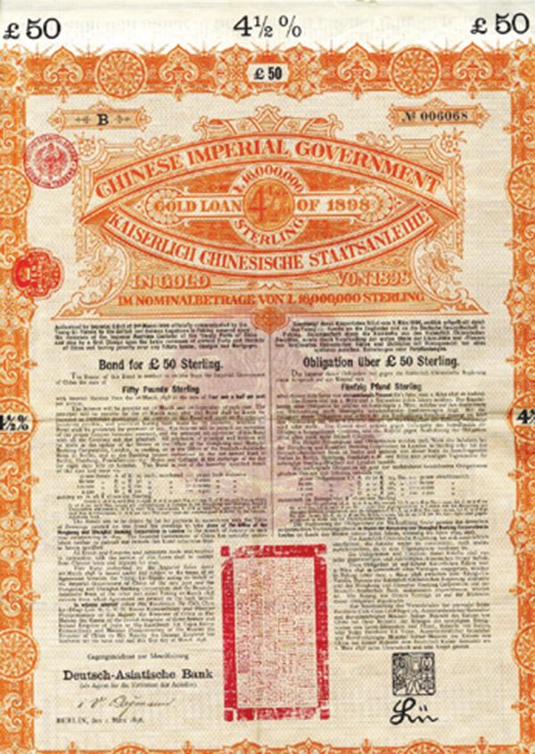 China, (Berlin) 1898, 50 Pounds Sterling, Ser. B. Issued and uncancelled, coupons attached, Orange border and light green under print with ornate title on top, printed in English and German, Fine to Fine+ condition. Issued by Deutsche-Asiatische Bank. Attractive and scarce bond. W&S.