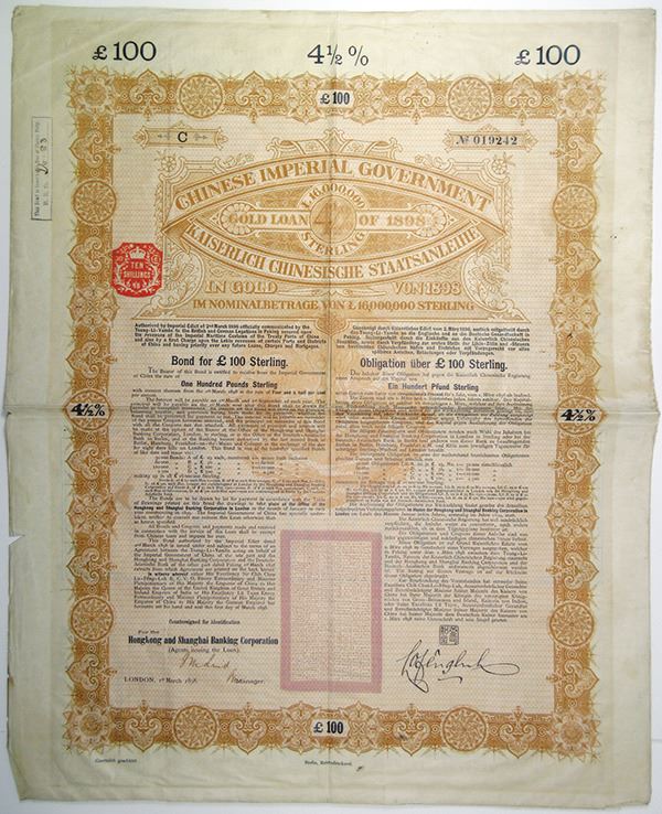 China. 1898, £100 Sterling I/U 4 1/2% Gold Bond, Black print on ornate brown border and red/orange under tint, Printed in English and German, The Hongkong and Shanghai Banking Corp., was the issuing agent. Fine-VF condition with damage to margins.