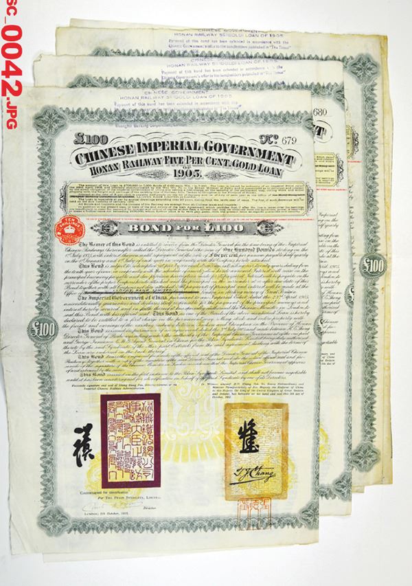 China , Imperial. 100 Pounds 5% Gold Loan. Green border with yellow underprint. British tax stamp. Coupons attached. With loan extension hand stamp notice. Fine, some with tape. 2 pieces. Pekin Syndicate Ltd