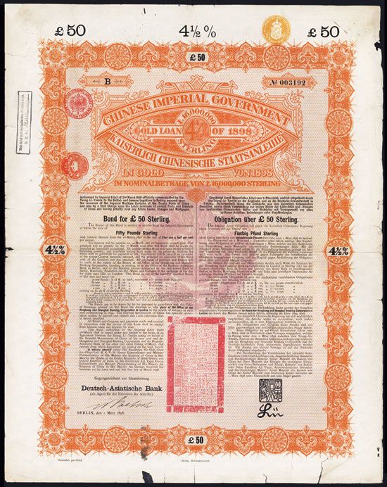 China, 1898, 50 Sterling, 4 1/2% Gold Loan, Issued bond, Black on orange border and underprint, No vignette but very ornate border; bond in both English and German, Coupons attached and amortization plan on back, F condition.