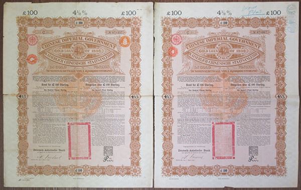 China, Lot of 2 Bonds, Both are 1898. £100, Ser. C, I/U 4.5% Sterling Coupon Bonds, Black print with brown orange border and light pink undertint, Printed in English and German, Issued by Deutsch-Asiatische Bank, Fine to Choice Fine condition. (2 pieces)