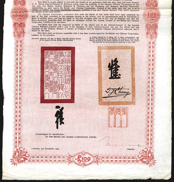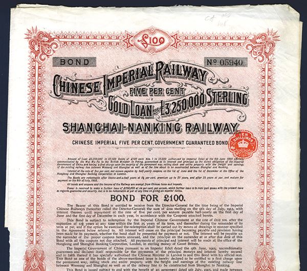 Chinese Imperial Railway 100 Pound 1904 5% Shanghai-Nanking Railway Bond. VF+.