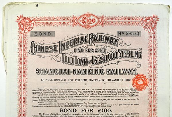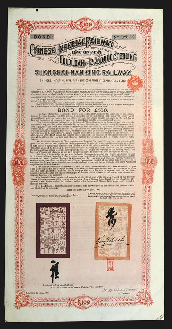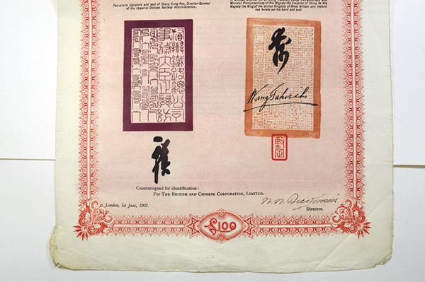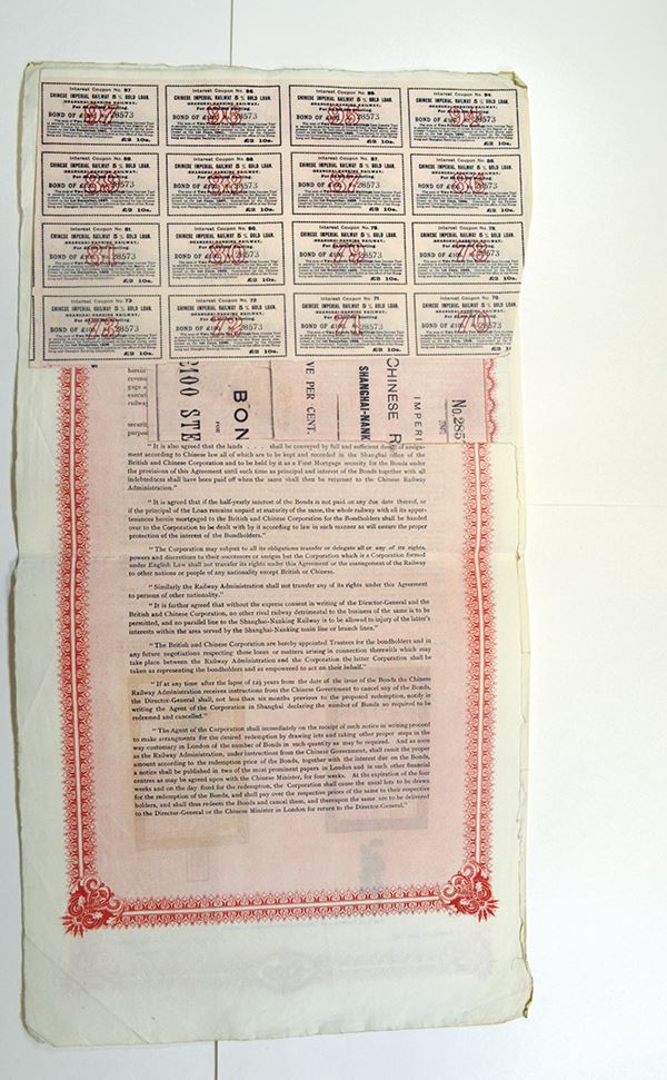 China, 100 Pounds. Rose border and underprint. British and Chinese Corporation, Ltd. 35 coupons. Very Fine.