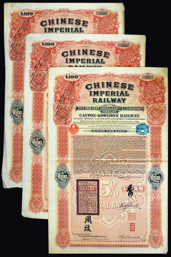 China, red frame, British & Chinese Corporation, one with a light notation in the top margin, otherwise all three VF+. [3]