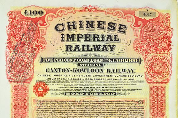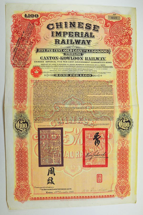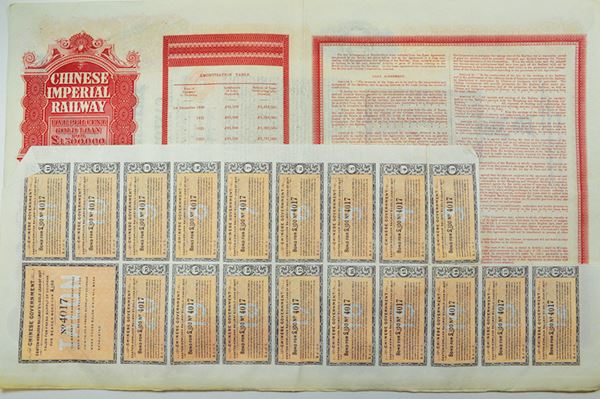 China, 100 Pounds. Rose frame and rose and yellow underprint. British and Chinese Corporation, Ltd. 18 coupons. Fine-Very Fine.