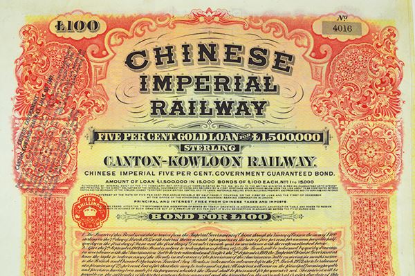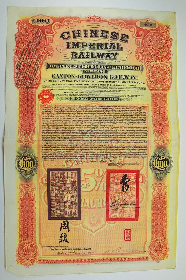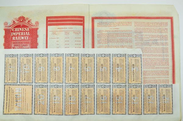 China, 100 Pounds. Rose frame and rose and yellow underprint. British and Chinese Corporation, Ltd. 18 coupons. Fine-Very Fine.