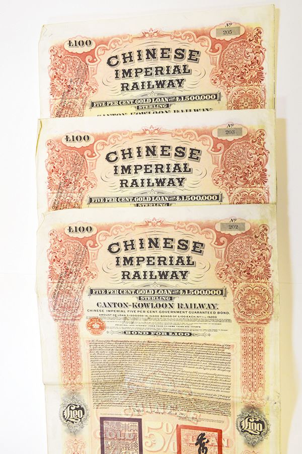 China. Lot of 3 pieces, all are £100 Issued and Uncanceled 5% Government Guaranteed Coupon Bond, Black print on large ornate red border and under tint, No vignette on certificate, company logo at top, British & Chinese Corporation, Fine-VF condition, 3 pieces.