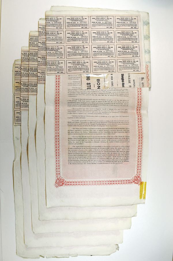 China, Imperial. 100 Pounds, Red border, coupon page. Rough edges. Very Fine. 5 pieces.
