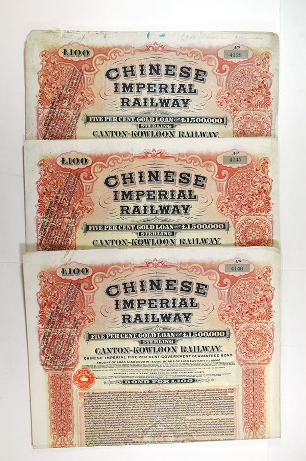 China - Imperial. 100 Pounds. British and Chinese Corp. Ltd. British tax stamp. Coupons attached. With 1936 amendment overprint of loan extension to 1985. Fine. 3 pieces.