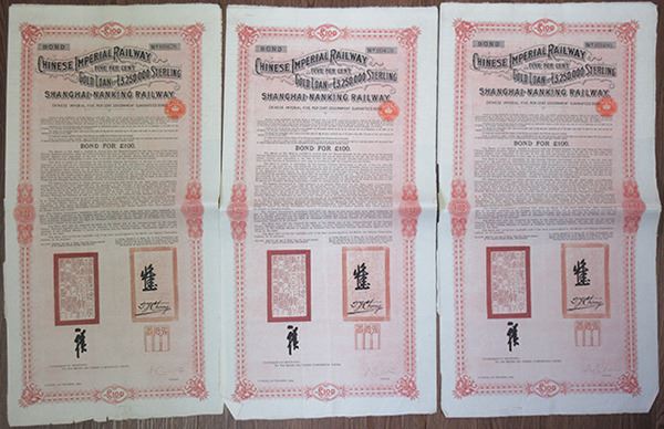 China, Lot of 3 bonds, All are 1904. �100, I/U 5% Shanghai-Nanking Railway Gold Coupon Bonds, Government Guaranteed, Black text with red border and pink undertint. Fine to VF condition with minor margin issues.