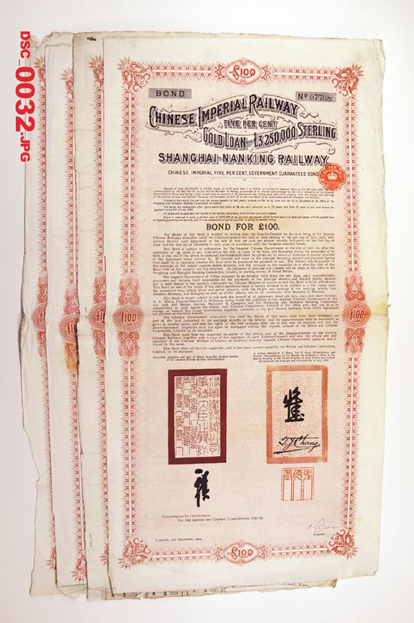 China. British and Chinese Corporation, Ltd. Red-brown border and underprint. With Coupons and British tax stamp. Large format with rough edges. 4 pieces.