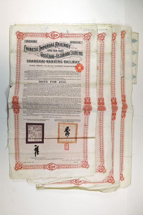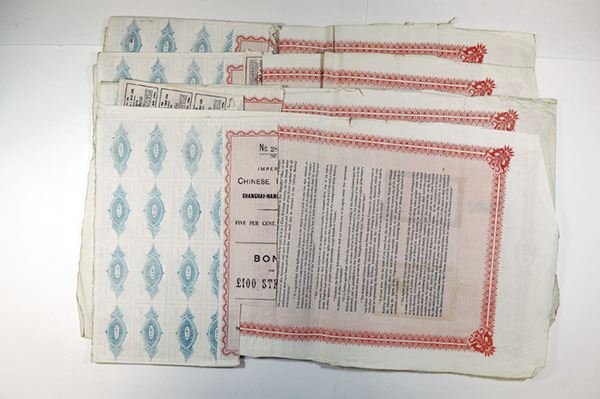 China - Imperial. 100 Pounds. British & Chinese Corporation, London. With British tax stamp. Coupons attached. Fine. 4 pieces.