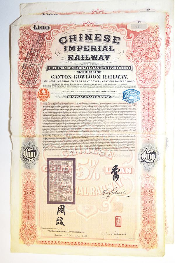 China. £100 Issued 5% Government Guaranteed Coupon Bond, Black print on large ornate red border and under tint, Company title at top, Fine-VF condition. W&S. 2 Pieces.