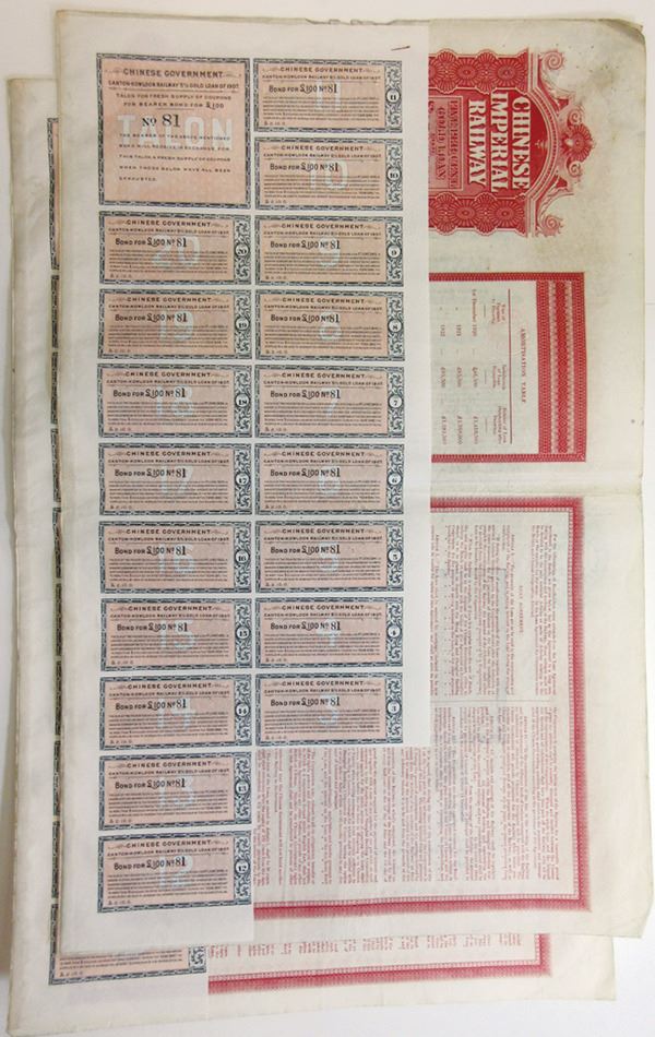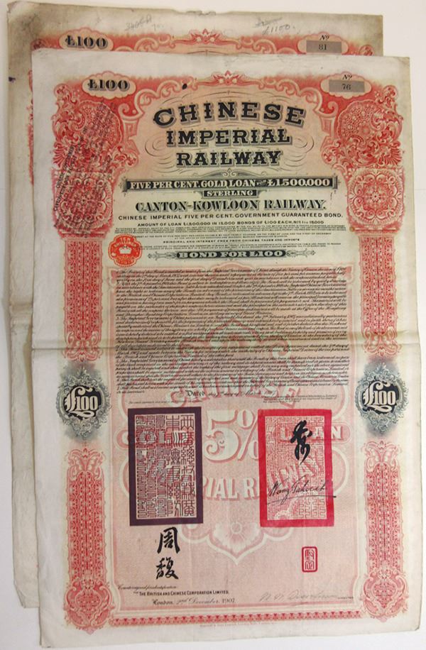 China. £100, Issued 5% Gold Loan Coupon Bond Pair, Black print on ornate red border with red under tint, Company title at top, Fine-VF condition, Waterlow & Sons Ltd. 2 Pieces.
