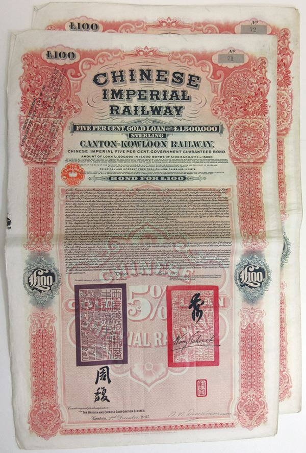 China. £100, Issued 5% Gold Loan Coupon Bond Pair, Black print on ornate red border with red under tint, Company title at top, Fine-VF condition, Waterlow & Sons Ltd. 2 Pieces.