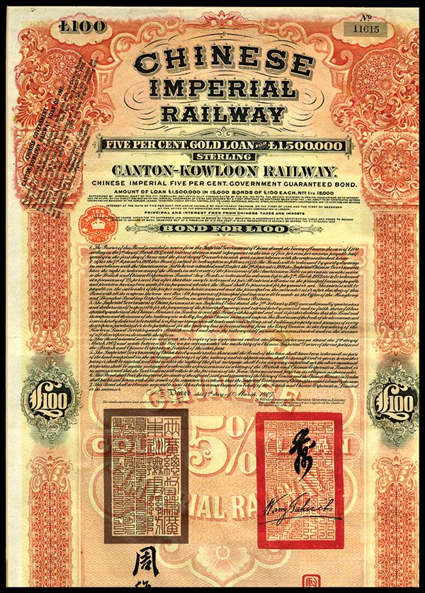 China, 1907, £100, black on red border, VF condition but taped to frame that could possibly be soaked, 18 coupons attached. W&S