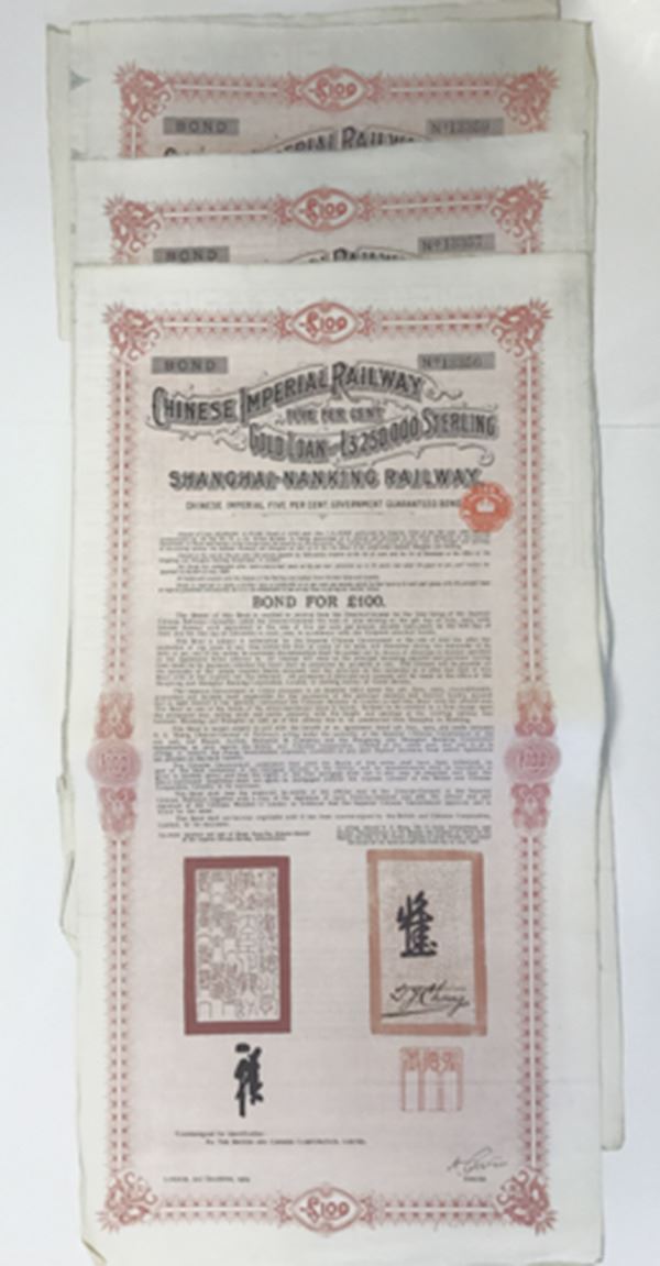 China. Lot of 3 bonds, £100 Issued 5% Coupon Bond, Black print on red border and under tint on large sized format, Ornate company title at top, Very Fine, some edge roughness.