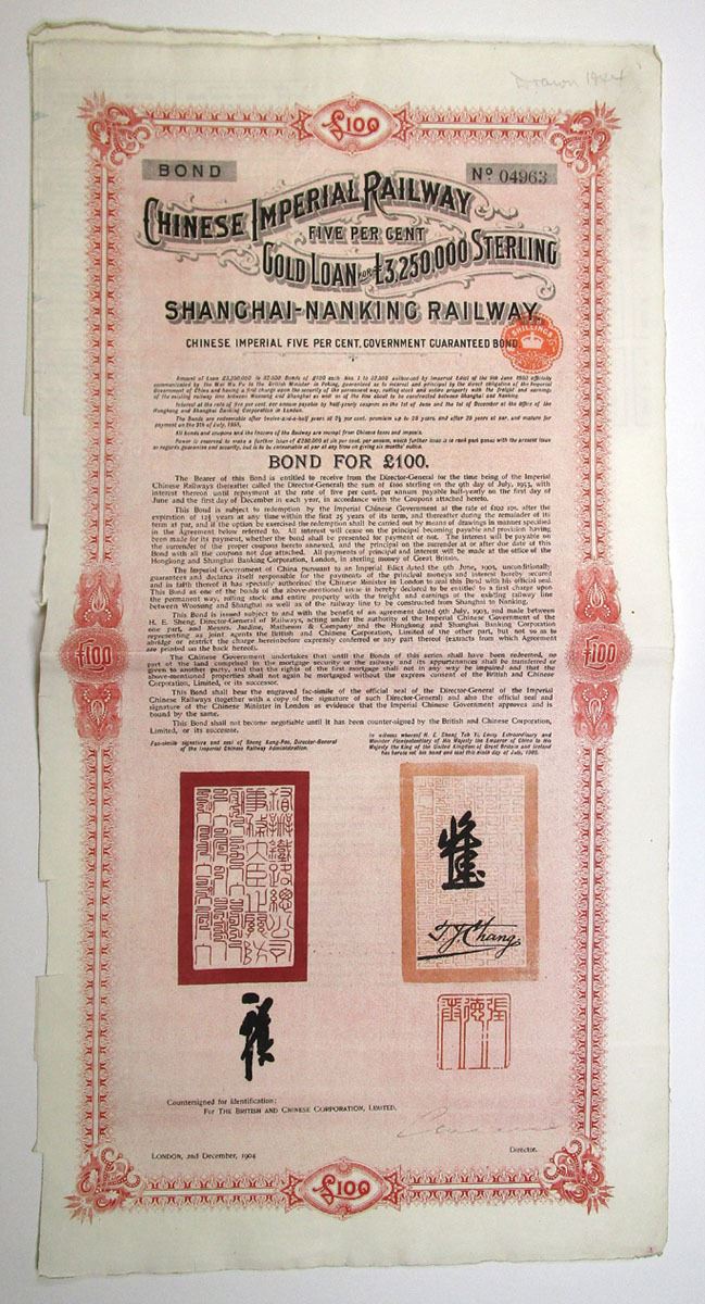 China, 1904. £100, 5%, I/U Government Guaranteed Gold Coupon Bond, Black print on red border and pink under tint on large sized certificate printed in English, Company title at top, 35 Coupons at back, Issued by the British and Chinese Corp. Ltd, Fine-VF condition with damage to margins.