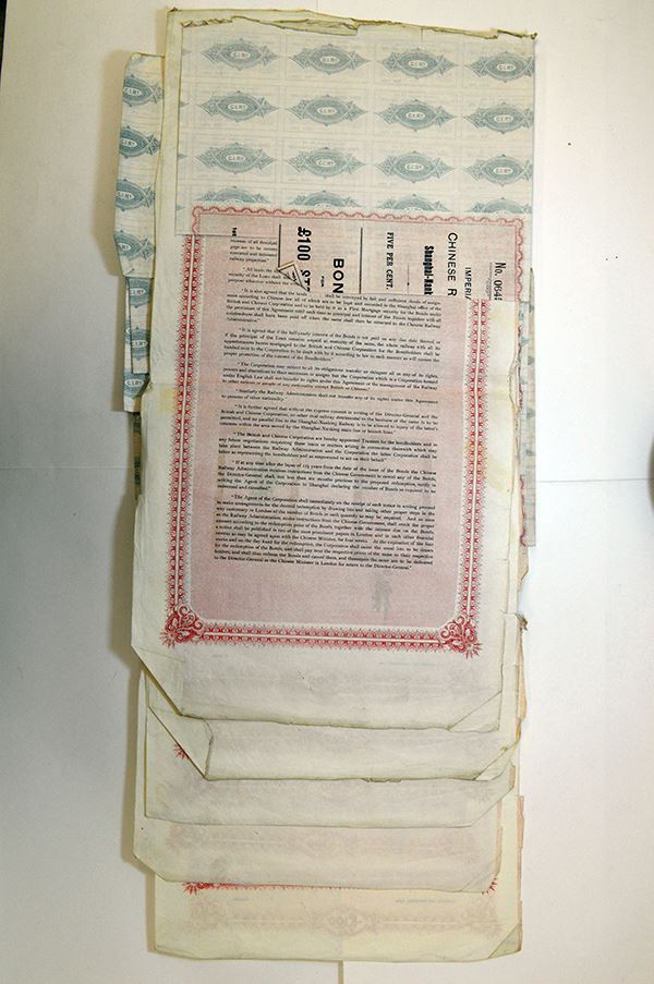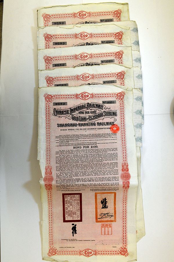 Issued by the British and Chinese Corp. Ltd. 100 Pounds. English text. With Coupons. 5 pieces.