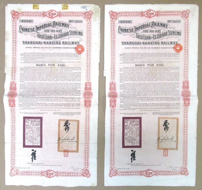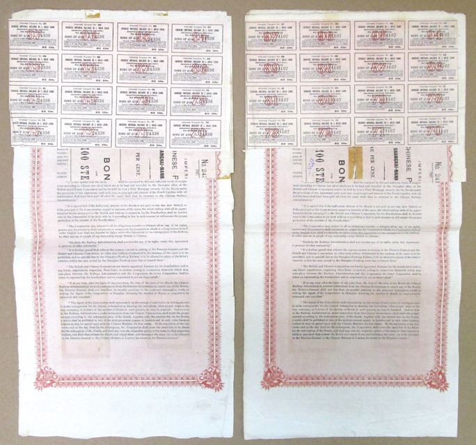 China, 1907. Lot of 2, £100, I/U 5% Shanghai-Nanking Railway Coupon Bond, Black text with red border and light red background. Fine condition with some writing in pencil at top, tape, and damage along margins. Issued by the British and Chinese Corp. Ltd. (2). Sold "AS IS" no returns accepted.
