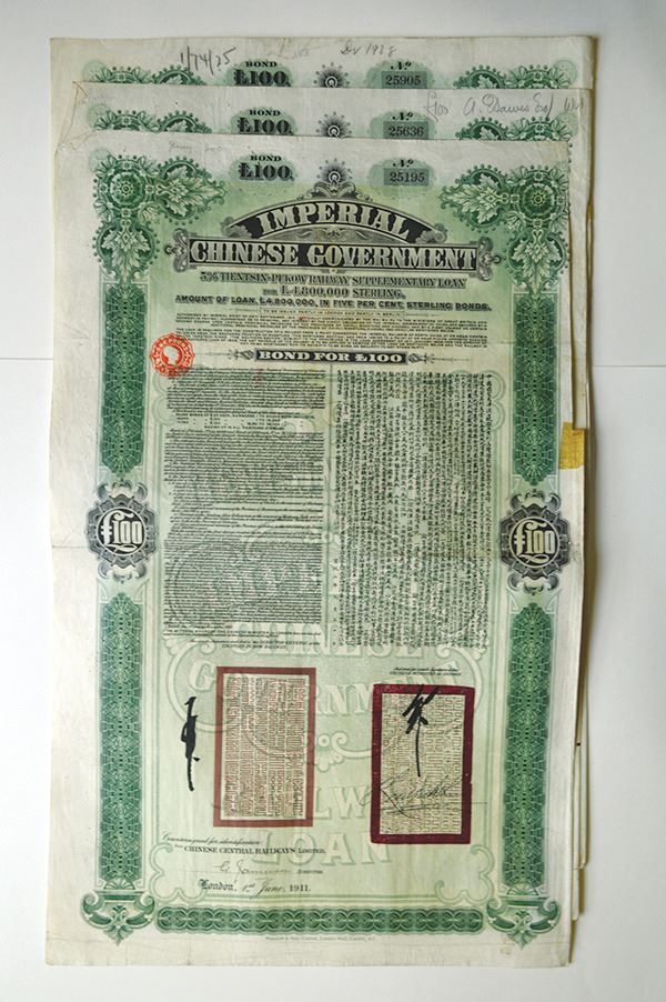 China. Lot of 3 bonds, all are £100 Issued 5% Supplementary Coupon Loan. Black print on large oversized green frame and under tint, Ornate company title at top, Fine-VF condition, Waterlow & Sons Ltd. 3 Pieces.