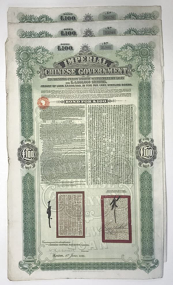 China. Lot of 3 bonds. £100 Issued 5% Supplementary Loan. Black print on large oversized green frame and under tint, Ornate company title at top, all with four coupons, all conditionally challenged, but pretty much intact. [3]