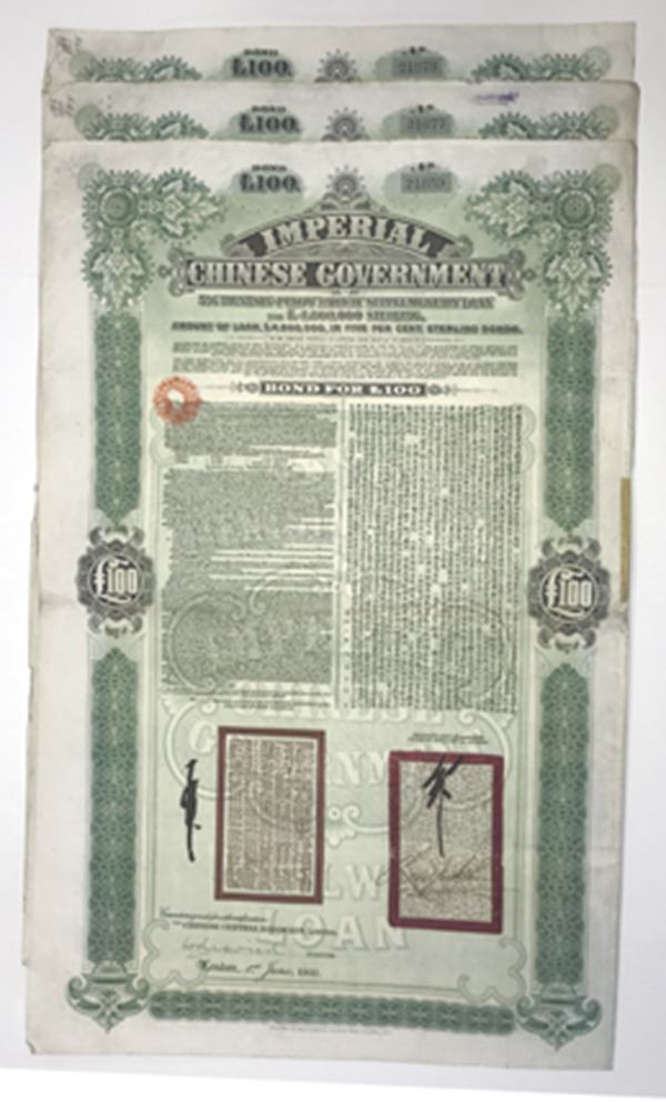 China. Lot of 3 bonds. £100 Issued 5% Supplementary Loan. Black print on large oversized green frame and under tint, Ornate company title at top, all with four coupons, all conditionally challenged, but pretty much intact. [3]