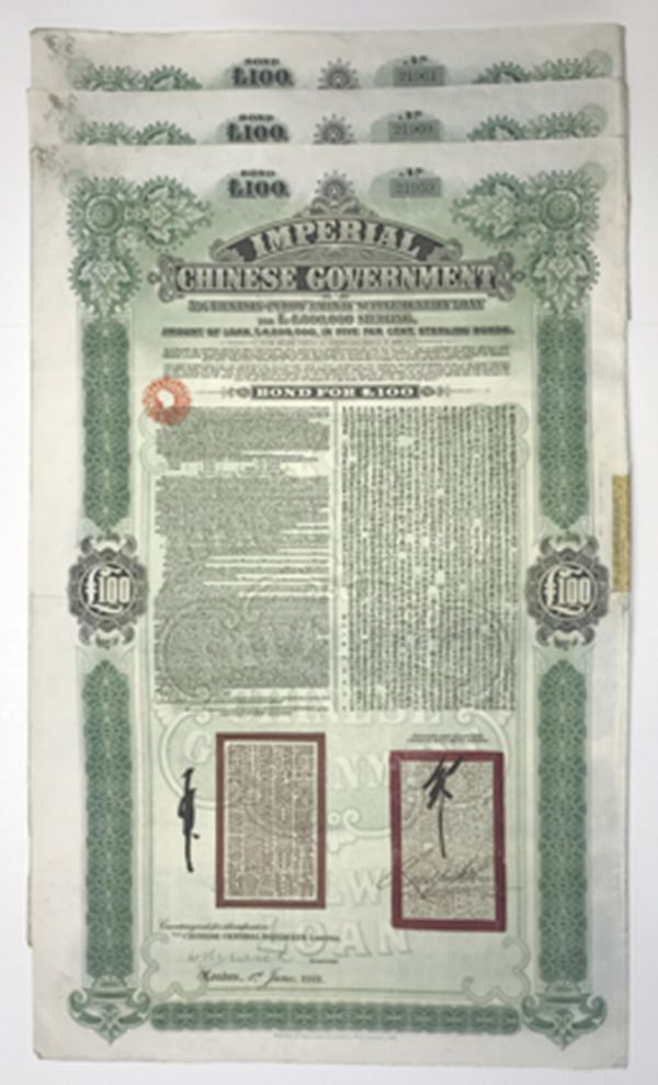 China. Lot of 3 bonds. £100 Issued 5% Supplementary Loan. Black print on large oversized green frame and under tint, Ornate company title at top, all with four coupons, all conditionally challenged, but pretty much intact. [3]