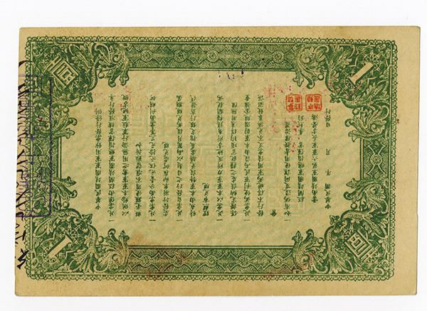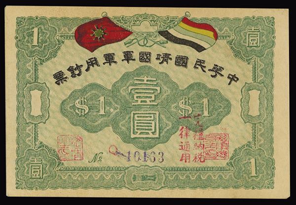 China, $1, P-S3814 (S/M#C263-1), Issued banknote, Green with multicolor flags on top, back green, S/N 10133, Uncirculated. Very attractive, rare and historic banknote.