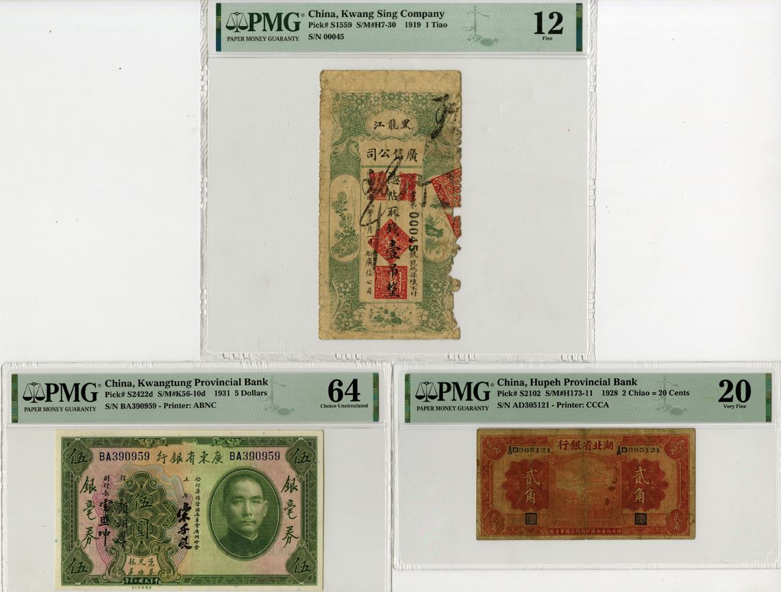 China, 1919-31. Lot of 3 Issued Banknotes, Includes: Kwang Sing Co. 1 Tiao, P-S1559 S/M#H7-30, 1919, Green and black printing with red stamps at center and right, S/N 00045, PMG graded Fine 12 with comment "Edge Damage"; Hupeh Provincial Bank 2 Chiao = 20 Cents, P-S2102 S/M#H173-11, 1928, Red printing with pagoda at center, S/N AD305121, PMG graded Very Fine 20 with comment "Rust", CCCA; Kwangtung Provincial Bank 5 Dollars, P-S2422d S/M#K56-10d, 1931, Green on m/c underprint with portrait of SYS at right, S/N BA390959, PMG graded Choice Uncirculated 64, ABNC. (3). Sold "AS IS" no returns accepted.