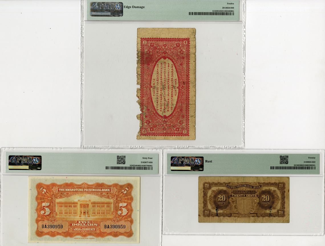 China, 1919-31. Lot of 3 Issued Banknotes, Includes: Kwang Sing Co. 1 Tiao, P-S1559 S/M#H7-30, 1919, Green and black printing with red stamps at center and right, S/N 00045, PMG graded Fine 12 with comment "Edge Damage"; Hupeh Provincial Bank 2 Chiao = 20 Cents, P-S2102 S/M#H173-11, 1928, Red printing with pagoda at center, S/N AD305121, PMG graded Very Fine 20 with comment "Rust", CCCA; Kwangtung Provincial Bank 5 Dollars, P-S2422d S/M#K56-10d, 1931, Green on m/c underprint with portrait of SYS at right, S/N BA390959, PMG graded Choice Uncirculated 64, ABNC. (3). Sold "AS IS" no returns accepted.