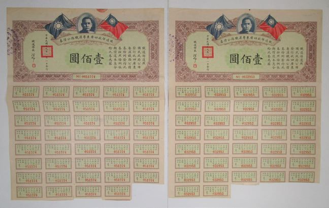 China…., Lot of 2 bonds, Both are $100 bonds with coupons attached, Black on brown border and Green underprint, Portrait of SYS at top center, Printed in Chinese, Both are I/U. VF-XF condition. (2) Sold "AS IS" no returns accepted.