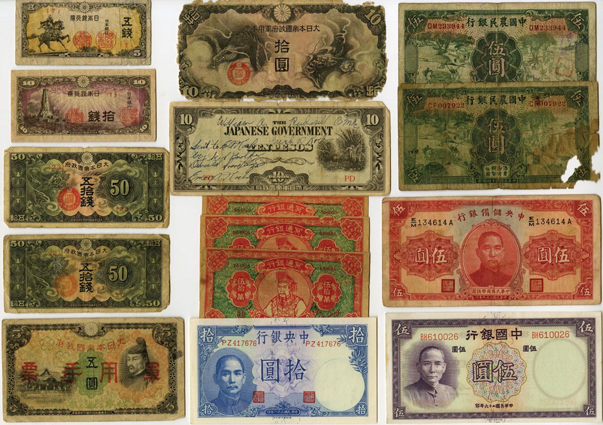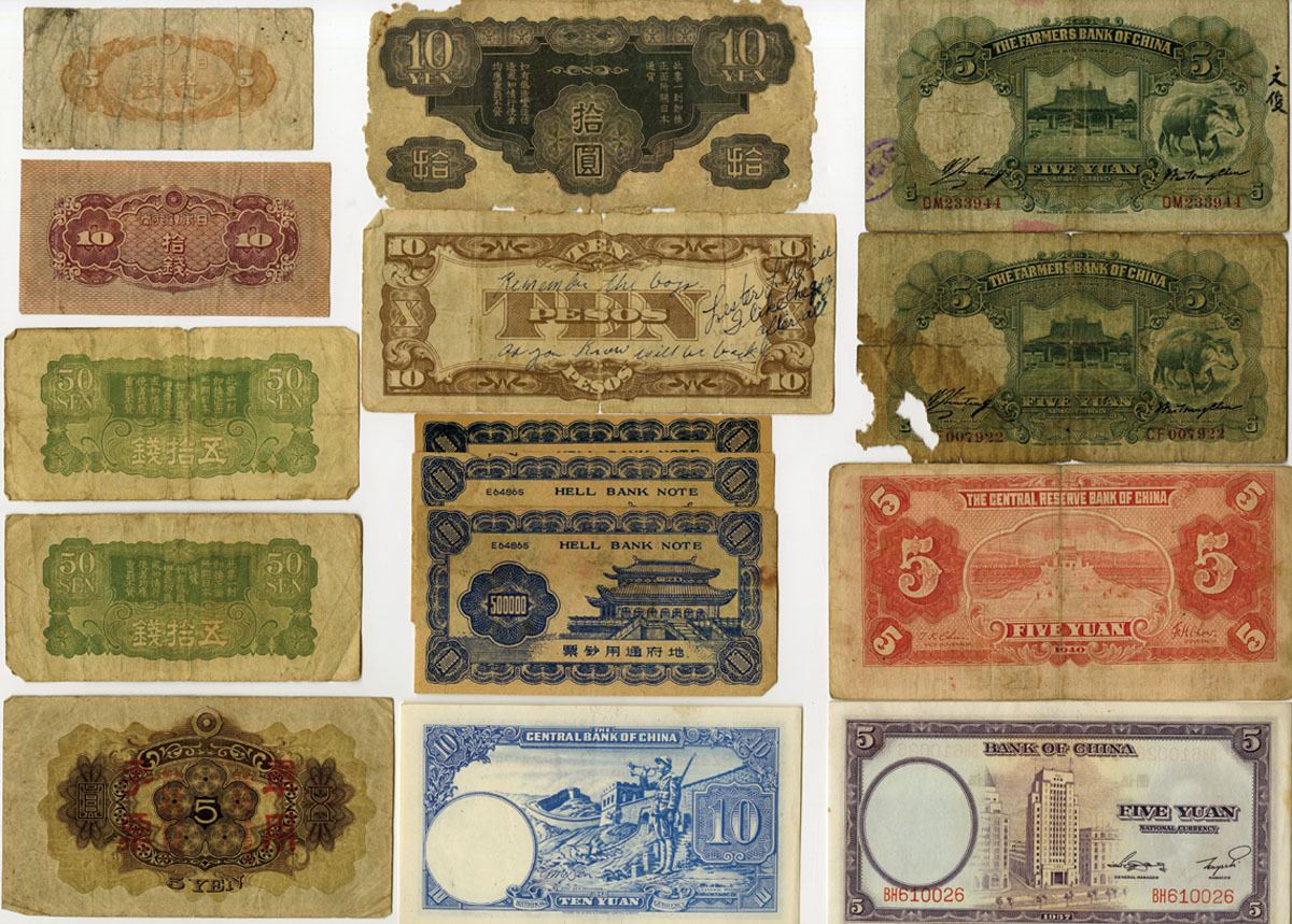 China and Japan. Lot of 15 Issued Banknotes from Various Banks, Including: Farmers Bank of China, Central Bank of China, Central Reserve Bank of China, Hell Bank Notes, Bank of Japan, and Japanese Occupation of the Philippines. Notes range from Fine to VF condition. (15).