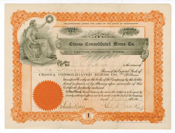 Alaska (Inc. in Washington), Prince Edward Sound mine location. 1000 shares, orange, seated woman holds wreath. This company claimed to have 28 placer claims on the Chisna River. Successor to the Central Alaska Gold and Copper Company. VF, pinholes, minor edge splits.