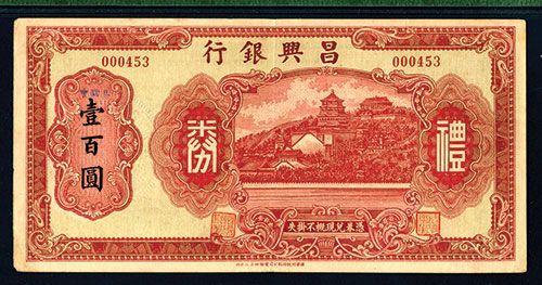 100 Yuan, P-Unlisted (S/M#C-12), Issued banknote, Red on light green underprint, buildings on hillside on right middle, back brown with stag, Confucius and two other venerated figures, S/N 000453, PMG graded About Uncirculated 55. Extremely attractive note rarely seen at auction.