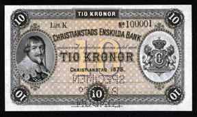 Christianstad. 1875. 10 Kronor. Ser.K, P-S131. Unlisted specimen banknote. Black on light yellow and blue with Christian IV of Denmark on left and Arms at right, back light blue and m/c. Pin punch "Specimen BW&C London" on bottom, Serial #100001. Choice to Gem uncirculated condition. Rare note.