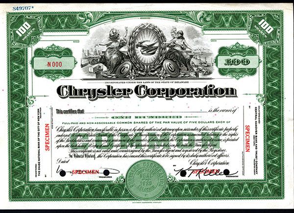 Delaware, 100 Specimen Stock, Black printing with green border and underprint, Hood ornament top center flanked by two allegorical women with roads on either side of them, POC's and red SPECIMEN overprints, VF-XF condition, SBNC.