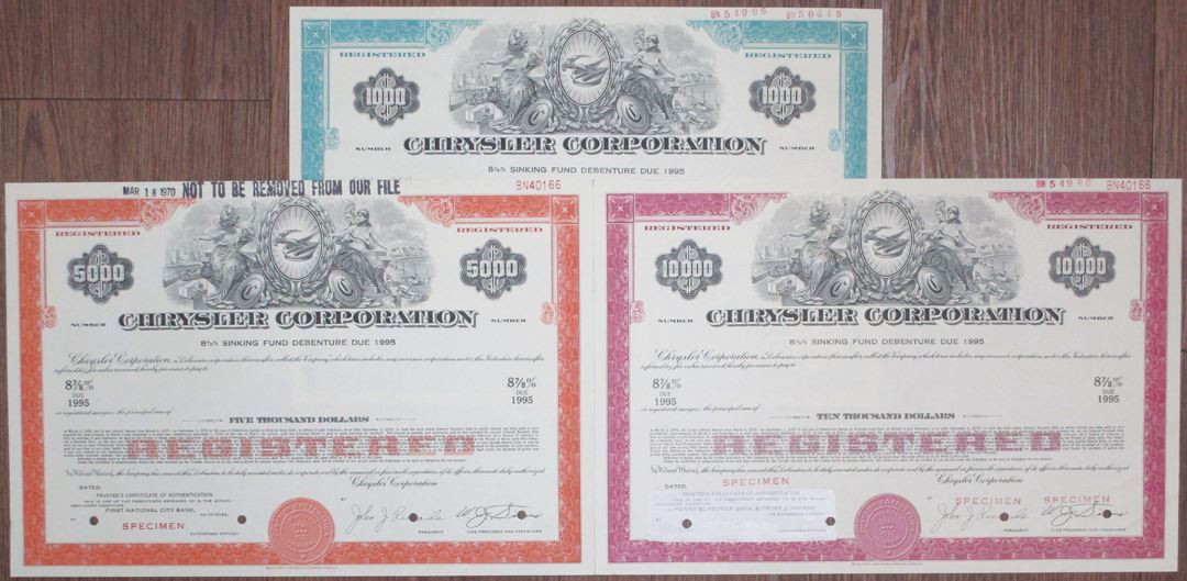 Delaware. Lot of 3 pieces, includes: 1970s $10,000 Specimen 8 7/8% Registered Sinking Fund Debenture Bond in pink; 1970 $5,000 Specimen 8 7/8% Registered Sinking Fund Debenture Bond in orange; 1977 $1000 Specimen 8 7/8% Registered Sinking Fund Debenture Bond in blue. Both have specimen POCs and are in Unc. condition. SCBN. (3)
