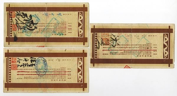 China, Lot of 3 bonds-banknotes. Includes $40; $50; $100, P-Unlisted, S/M#C237-?, All red with brown, green and black, building in middle, backs brown with small text, VF to XF condition.