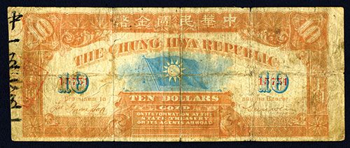 1936, $10 Republic Gold Unit Currency Note, S/M #C262-2, (Chinese Catalog Vol.14, Page 6 and Vol.15, Page 87), VG condition, Light brown border surround light blue flag on face, green border and flag on back. S/N 13047. Rare military related banknote.