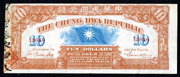 China, 1936, $10, S/M #C262-2, (Chinese Catalog Vol.14, Page 6 and Vol.15, Page 87), Choice VF-XF condition with small pin holes on left borders, Light brown border surround light blue flag on face, green border and flag on back. S/N 13048. Rare military related banknote.
