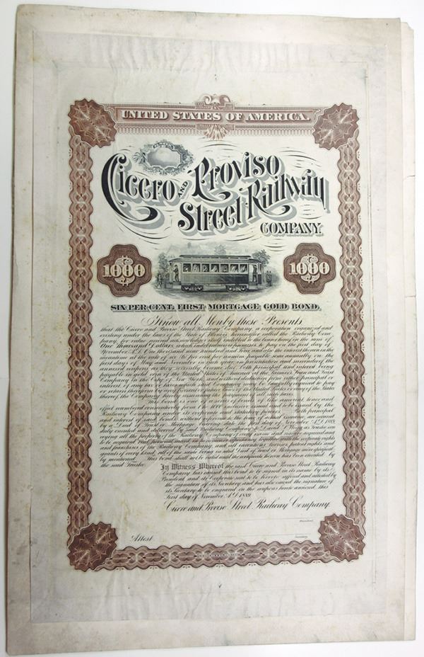 Illinois. 1889. Unique proof bond. $1,000, 6% 1st Mortgage, Gold Bond. The proof has a street car vignette on top with fancy title. Coupons are present on a separate sheet. Printed on india paper on card. Brown border. Printed by S.D.Childs & Co, Chicago.