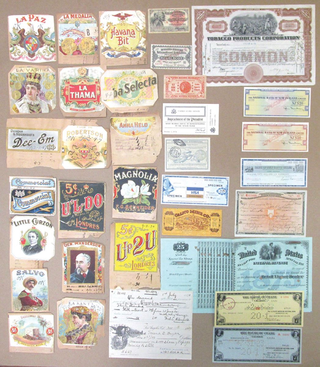 U.S., Australia, and Canada, Lot of 30+ Pieces of highlighted by 17 sample book cigar labels (not specimens, but examples from the manufacturers inventory for reference), Includes items from International Exhibitions, Special Tax Forms, Wooden Nickels, Tobacco products, Specimen Travelers Check, Cigar Labels and more. Items range from VF to CU condition. (30+). Sold "AS IS" no returns accepted.