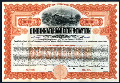 Ohio, 1909, $10000, 1st and Refunding Mortgage 4% 50 Year Registered Gold Specimen, Black on orange border and underprint, Locomotive at station, VF condition, ABNC. Unlisted bond in Cox.